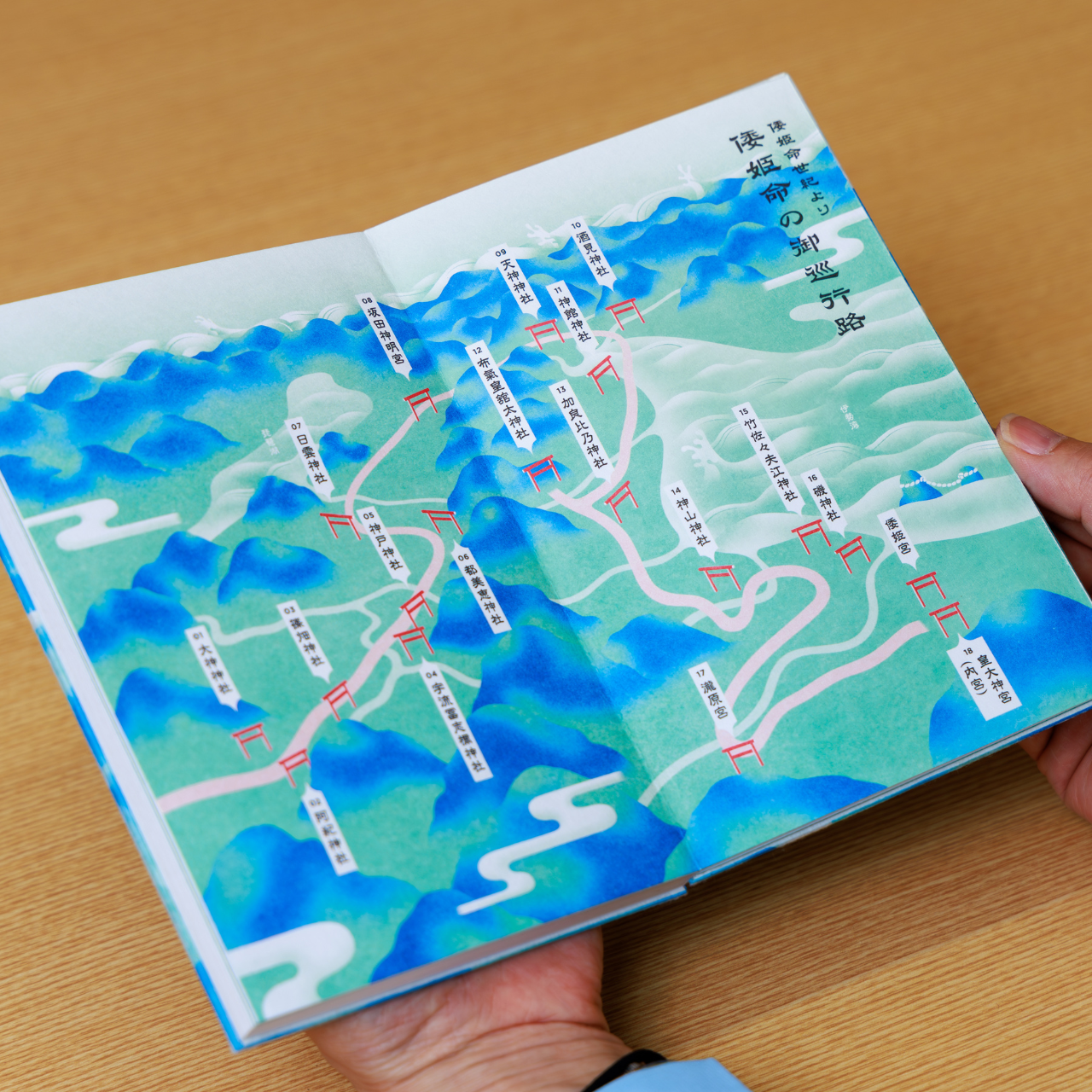 本御朱印帳では「巡る」をキーワードに、倭姫命が辿った路をコンセプトとし、それぞれの土地の由来やルートマップが記されたストーリー型御朱印帳といたしました。当時のルートを辿りながら思いを馳せ、御朱印を思い出とし記憶する。そんな想いを詰め込んだ一冊となっています。